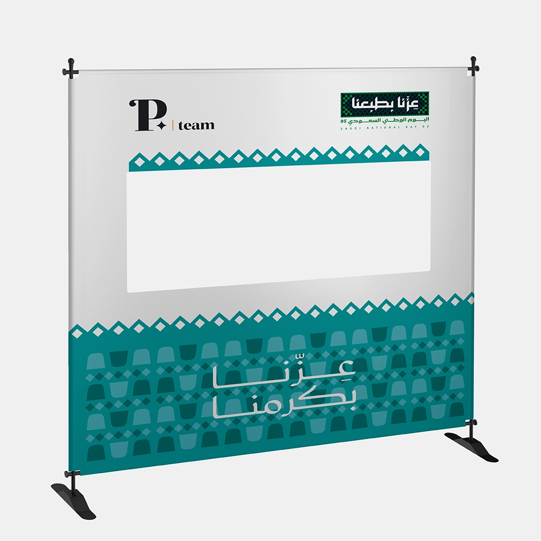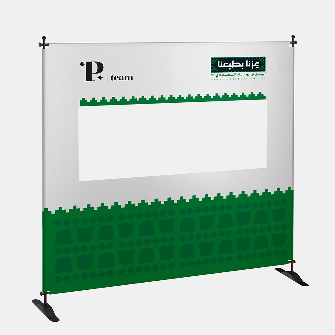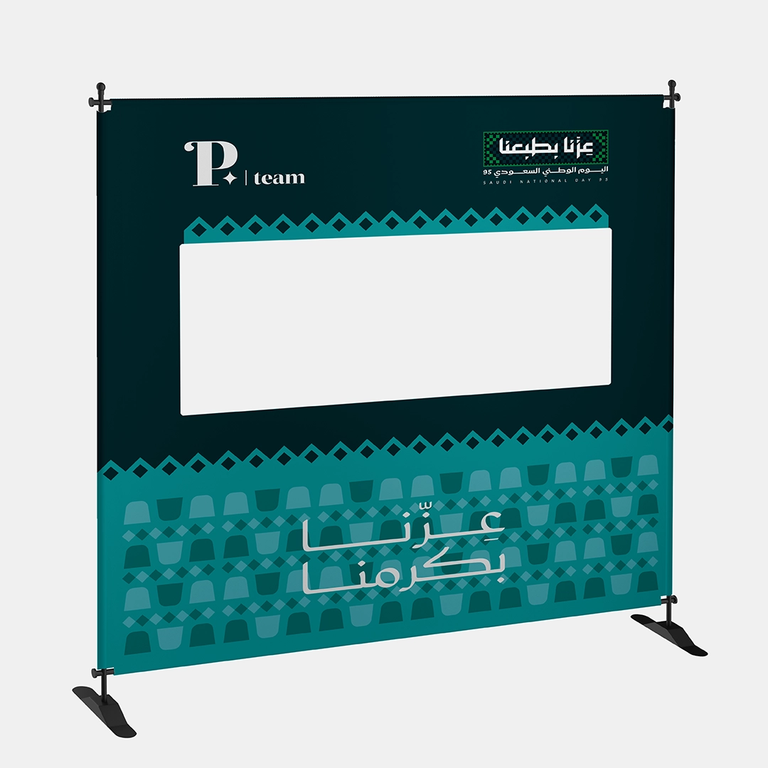 استثمر كل لحظة تصوير في إبراز علامتك التجارية وسط أجواء وطنية مفعمة بالفخر مع اطار تصوير بوب أب ثلاثي الأبعاد لليوم الوطني 95! فكرة تصوير مبتكرة بفضل تصميم الإطار ثلاثي الإبعاد مع فتحة مدمجة تسمح للضيوف بالوقوف خلف القماش لتصوير لقطات نابضة بالحياة تُبرز شعار اليوم الوطني (عزنا بطبعنا) بجوار شعار شركتك، فيحوّل كل صورة إلى إعلان تفاعلي يخلّد ذكريات لا تُنسى.