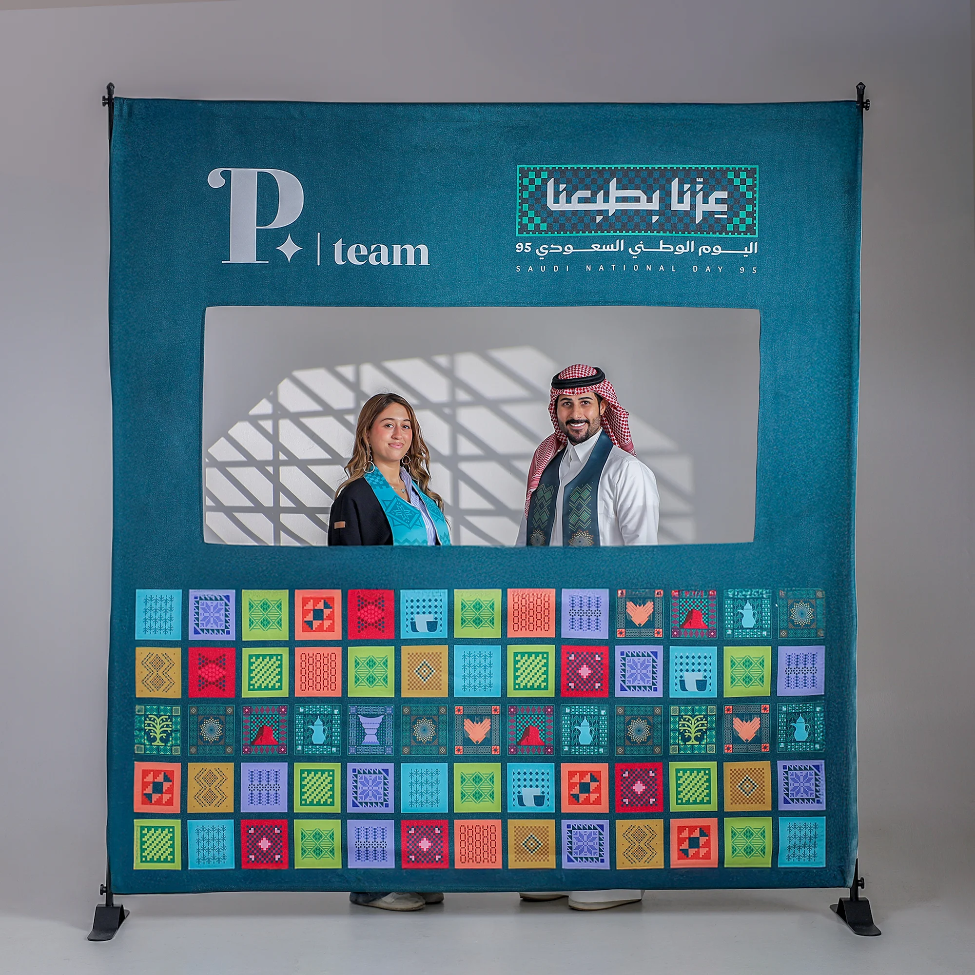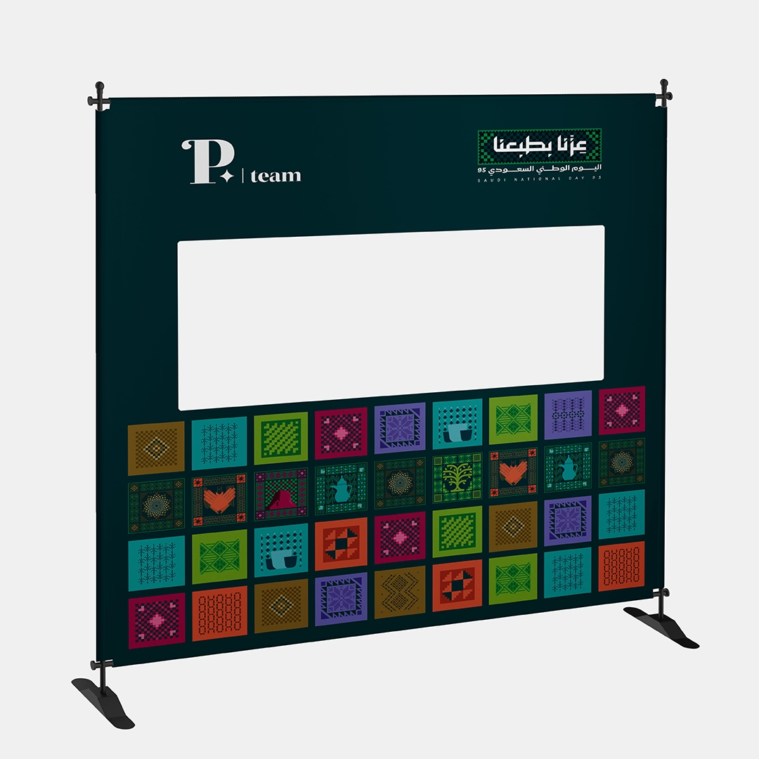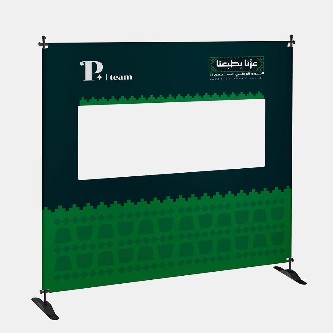 استثمر كل لحظة تصوير في إبراز علامتك التجارية وسط أجواء وطنية مفعمة بالفخر مع اطار تصوير بوب أب ثلاثي الأبعاد لليوم الوطني 95! فكرة تصوير مبتكرة بفضل تصميم الإطار ثلاثي الإبعاد مع فتحة مدمجة تسمح للضيوف بالوقوف خلف القماش لتصوير لقطات نابضة بالحياة تُبرز شعار اليوم الوطني (عزنا بطبعنا) بجوار شعار شركتك، فيحوّل كل صورة إلى إعلان تفاعلي يخلّد ذكريات لا تُنسى.